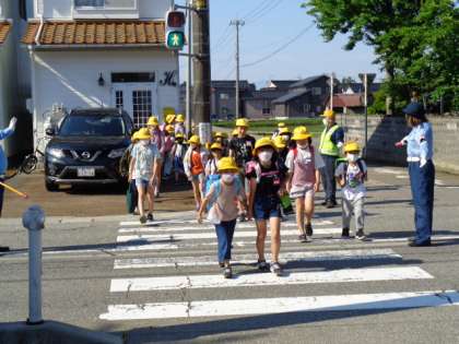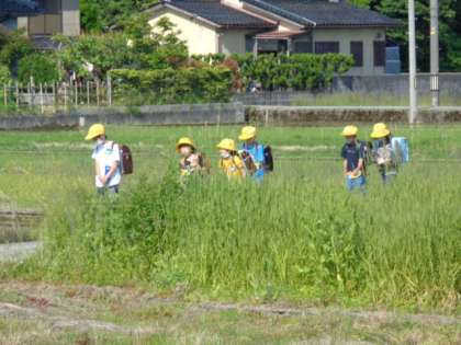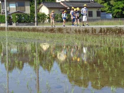 青空に子供たちの元気な挨拶がこだましているようです。昨日5年生が田植えをした水田の横を通って、はまっ子たちは今日も元気に登校しています。