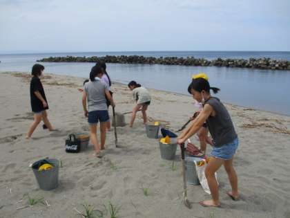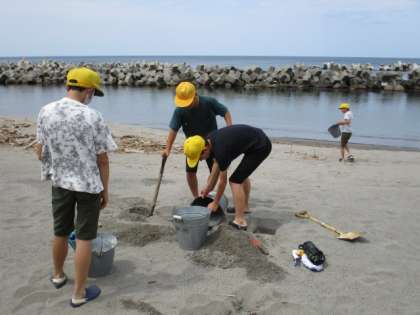 今日の6年生図画工作科の学習では、砂浜まで行き、造形遊びをしました。子供たちはグループに分かれて、砂を固めたり、穴を掘ったりして活動しました。