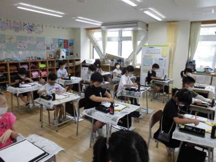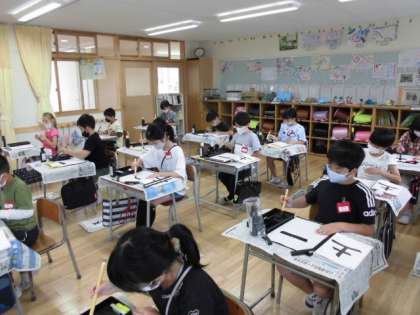 今日の書写の時間は「土」という字の練習をしました。たて画は初めてでしたが、筆先の向きも考えながら書きました。筆にも慣れ、とても上手に書けるようになってきました。
