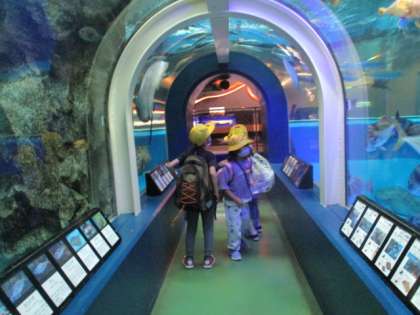 大きな水槽では、トンネルの中から、たくさんの魚が悠々と泳ぐ姿を見ました。