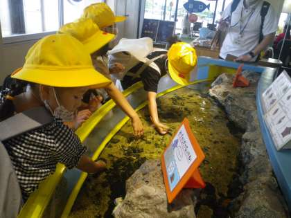 ふれ合い水槽では、ガラエステコーナーで小さな魚に手をきれいにしてもらうことを楽しんだり、ヤドカリやヒトデをさわったりして、生き物とのふれ合いを楽しみました。
