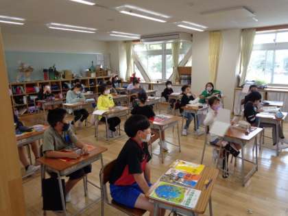6年生は家庭。朝食のおかずづくりを終えて振り返りをしています。