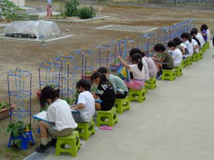 1年生は中庭に出て大きく成長してきたアサガオの観察です。