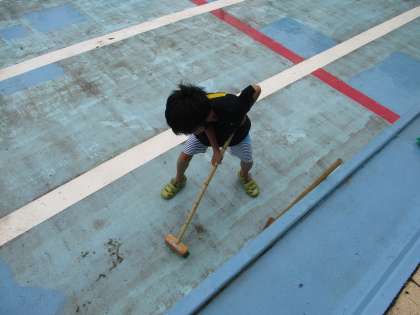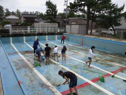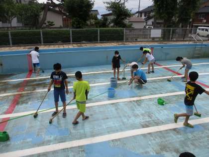 今日の4限にプール清掃を行いました。6年生は、デッキブラシを使ってプールの底を磨きました。子供たちは、汚れを見付けると一生懸命こすっていました。子供たちのがんばりで、ピカピカのプールになりました。