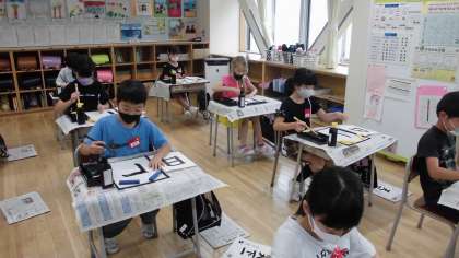 今回の書写の学習は「おれ」の練習でした。今までとは違い、筆の使い方がとても難しいです。ゆっくりと「おれ」に気をつけながら練習しました。何度も練習するととても上手に「おれ」ができるようになってきました。来週の清書も楽しみです。