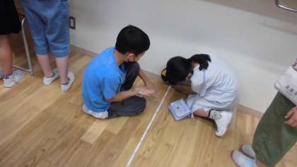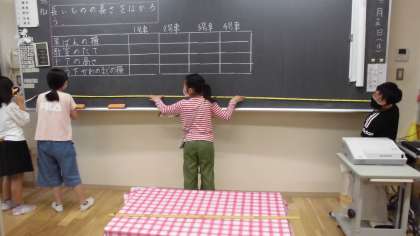 3年生の算数の時間には、巻き尺を使って長いものの長さを測っています。今日はグループに分かれて黒板の長さや教室のたての長さなどを測ってみました。長さを測るルールに気を付けながら、友達と協力してはかりました。ドアの高さは思っていたより短くてびっくりしました。