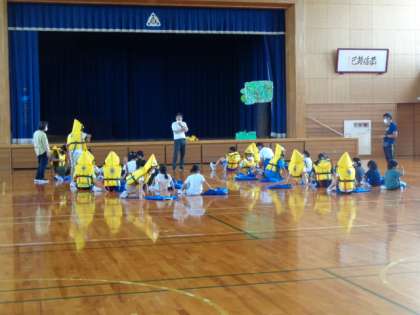 6月23日(木)に津波を想定した避難訓練を予定しています。毎年行っている訓練ですが、1年生は初めての体験です。今日は、避難の際のライフジャケット着用の練習を行いました。練習には1年生1人に対して1人の6年生が担当。丁寧に教えていました。6年生の頼もしい姿を見ることができました。
