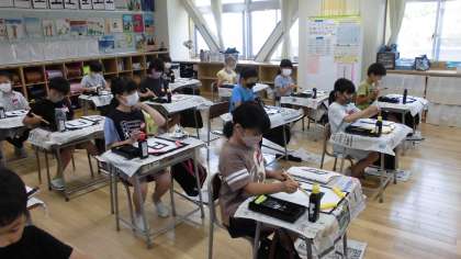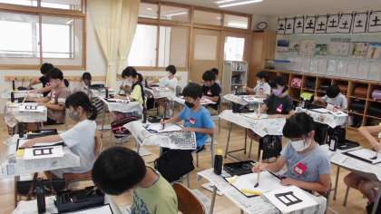習字の学習にも慣れ、落ち着いて取り組めるようになってきました。筆の入り方やおれ方なども丁寧に書くことができるようになりました。今日は「日」という字の清書です。一つ一つ確認しながら丁寧に書きました。