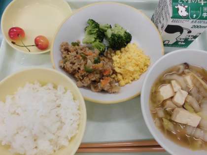 ぶたそぼろは、ピーマン等の野菜が入っていました。炒り卵、ゆでブロッコリーと混ぜてどんぶりにして食べたらとてもおいしかったです。かわいいさくらんぼも甘くて最高でした。
