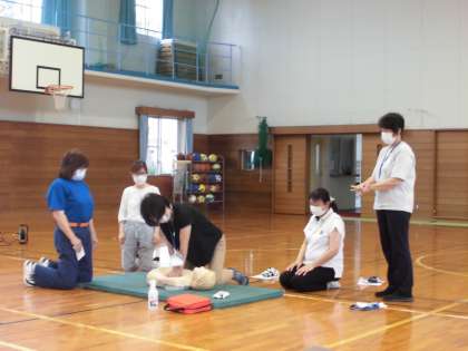 明日、プール開きがあります。その前に大切な救急救命講習会を行いました。富山北消防署等から4名の方が講師として来てくださいました。育友会の保護者の方と職員が参加しました。