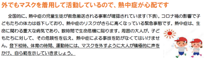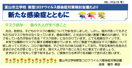 「富山市立学校 新型コロナウイルス感染症対策検討会議だより」19号が発行されました。今回は「マスク着用」について富山市立学校新型コロナウイルス感染症対策会議で話し合われた内容が書かれています。保護者の皆様には6月24日にお子様を通して配付する予定ですが、本ホームページで両面全文を見ることができます。右側のコーナー、または下の部分をクリックしてください。なお、右のコーナーではこれまでのバックナンバーも見ることができますのでご利用ください。