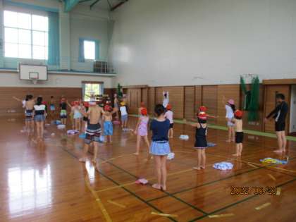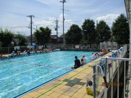 6年生の初泳ぎの様子です。縦割り班の1年生とバディを組み、水を掛け合ったり、プールをぐるぐる回ったりしてプールを楽しみました。子供たちは、とても気持ちよさそうでした。