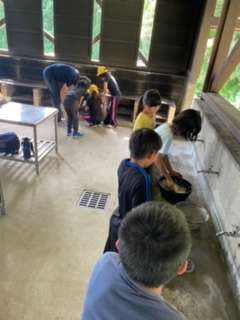 調理班は、米研ぎからスタート。その次は、手分けして材料切りです。