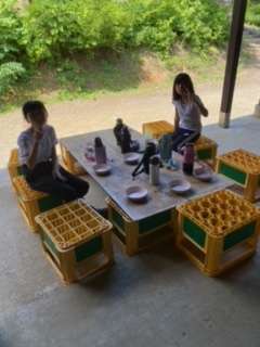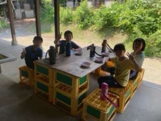 調理班が食卓机をセットし終わり、くつろいでいます。