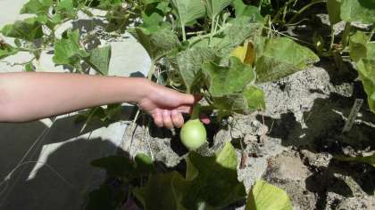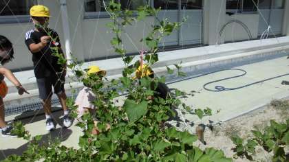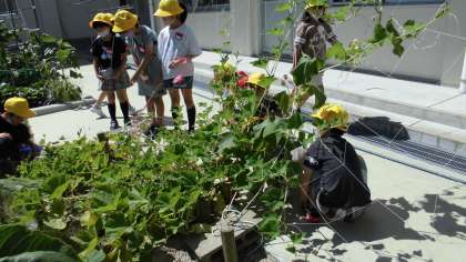 3年生は総合的な学習の時間にひょうたんを育てています。天候がよくなかったので、育ちが悪く、なかなか実ができなかったのですが、ようやくぷっくりとしたかわいい実ができてきました。「今度は栄養をあげよう」「葉が病気みたいになってきたから薬をかけよう」など、これからのお世話の話し合いをしました。大きな実になるのが楽しみです。
