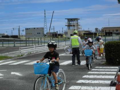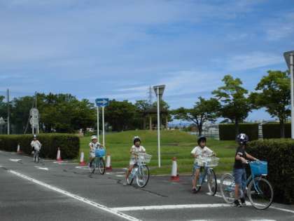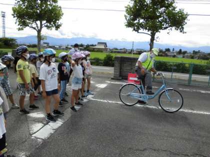富山県交通公園交通安全博物館へ行き、自転車教室を行いました。3・4年生は、交通公園に到着後、それぞれの学年に分かれ、交通安全のビデオ視聴をしたり、自転車の実技演習をしたりしました。実技練習では、最初に「左から乗る。左に下りる。左側通行。」の自転車乗車の3つの左を教えていただき、広い交通公園で交通ルールを守りながら、自転車に乗る練習をしました。何回も練習していると、自然に一時停止や左右の確認などしっかりとでいるようになってきました。