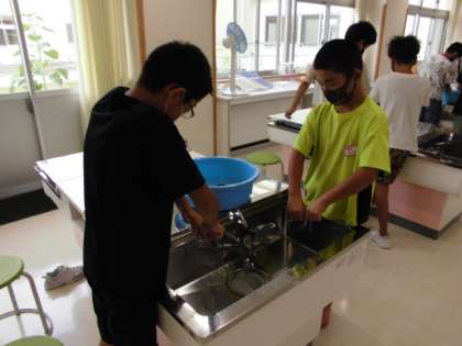 6年生は、家庭科の学習で手洗いに挑戦しました。粉石けんを溶かした洗剤液に靴下を浸け、もみ洗いしました。汚れが液に溶け出してくる様子に子供たちは驚きの声を上げていました。