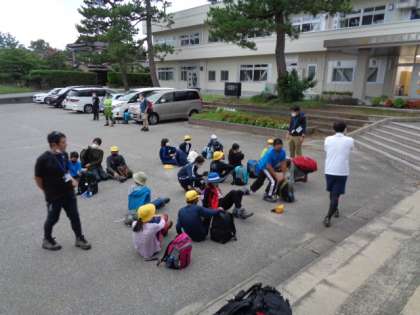 6年生は今日、立山に登ります。5時20分、参加者は集合完了。養護教諭が一人一人の健康観察を行いました。