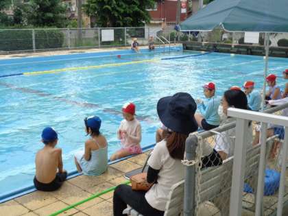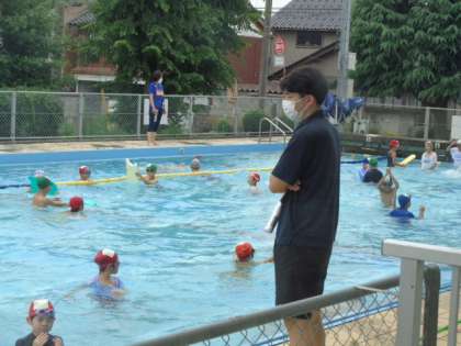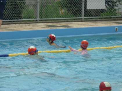 今日のプール開放には、50人の子供たちが参加しました。泳力を競う子供たち、まず水慣れのために遊ぶ子供たちとそれぞれ元気に活動しました。