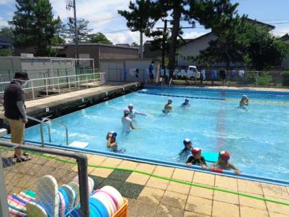 本日のプール開放には33人の子供たちが参加しました。青空の下、熱中症指数がやや上がりましたが、水分補給にも気を配り、元気に水を楽しみました。