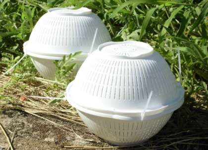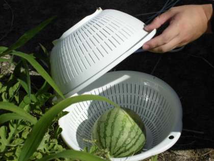 さて、2年生が生活科で育てている野菜もまだまだ元気に育っています。しかし、収穫を心待ちにしていたスイカが、3つも野生動物に食べられてしまうという事態が発生しました。そこで、残りのスイカを守るために、担任が調べたアイディアを実行。スイカをザルで包み、結束バンドでしばって保護をしてみました。これでしばらく様子をみたいと思います。