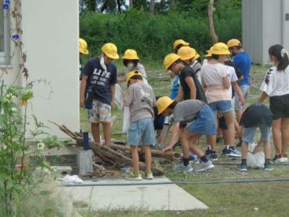 4年生は海岸まで出かけ、使えそうな材料を見つけ集めてきた後、制作に取りかかりました。のこぎりを使う雰囲気はまさにクリエーターです。