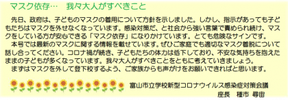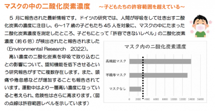 教室内での授業中、子供たちは基本的にマスクを着用しています。「新たな感染症とともに」Vol.19にあるように、マスクを着用したままがつづくとマスク内の二酸化炭素濃度が高くなり、学習効率に影響があります。そこで、発言のない場面(例 確認プリントに取り組む)では、マスクを外すこともあります。