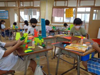 1年生は図工。「おってたてたら」何ができるでしょう。