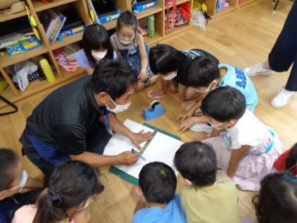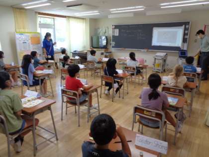 2年生は図工。カッターの使い方を学んでいました。危ないので、もし使うときは、先生の見守りの下、使います。