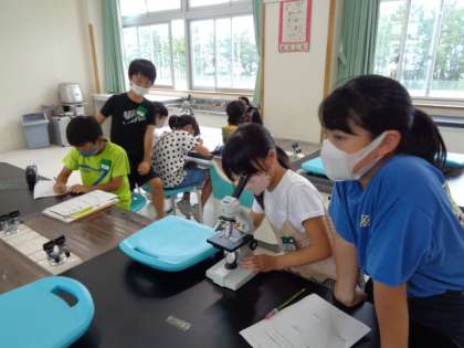 5年生は理科。顕微鏡で花粉を観察しています。