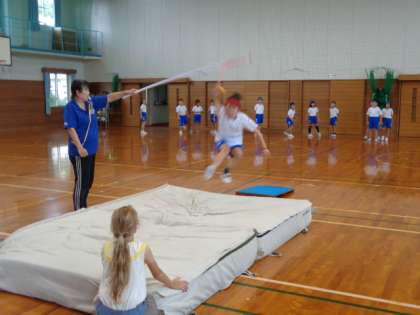 3年生は体育。ボールに向かってジャンプ!