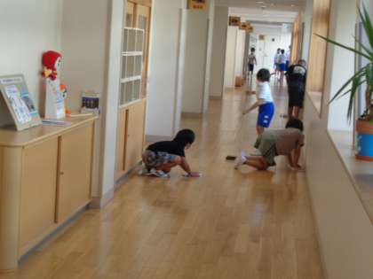 ほうきで掃く人、その後ろからぞうきんがけする人、チームワーク抜群です。