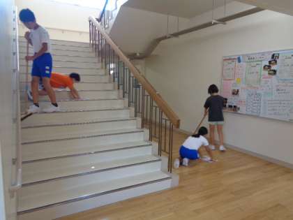 高学年がリーダーとなって、縦割り班で全校を協力して清掃活動をしています。