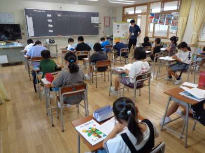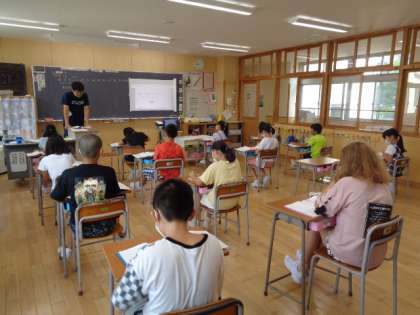 4年生は算数。わり算の授業前にまず百ます計算に挑戦していました。