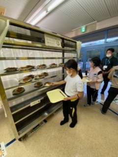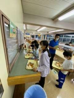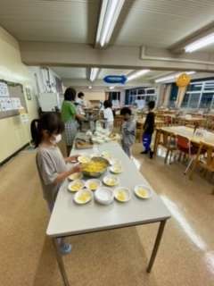 食事係の準備ができたようです。係以外の子供たちが呼ばれました。自分で取り、席に着きます。