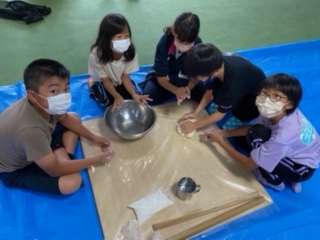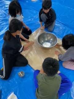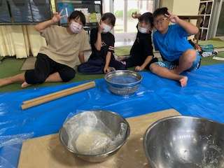 うどんをこねています。みんなで分担してこねた小麦粉を、また一つにまとめて、20分以上、寝かせます。