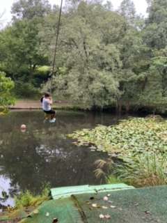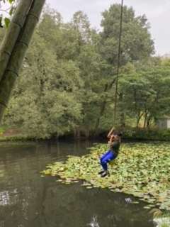 午前中の活動について、追加です。ロープにつかまって勢いよく池に向かってグーンと飛びました。思いの外、気持ちよかったです。