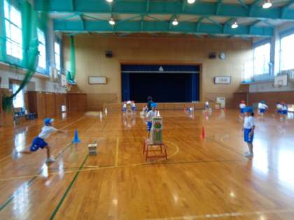 1年生は予定していた校外学習が雨で延期となったため、体育をしています。的に向かってボールを投げています。