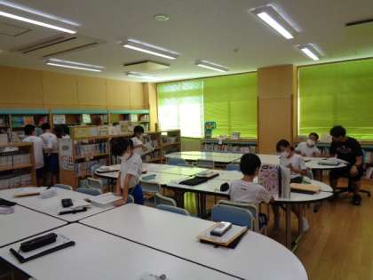 5年生は総合。「全力"姿を変える米"大作戦」として、図書室で調べ学習です。