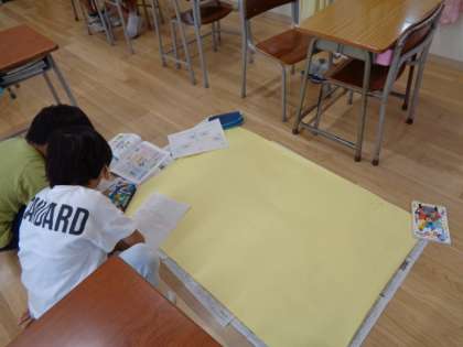 社会科では「店ではたらく人」の学習をしています。スーパーマーケットに見学に行って調査をしたり、店長さんにインタビューしたりして学びを深めています。今日は今まで学習してきたことを新聞にまとめる準備をしました。