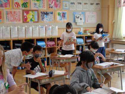5年生は算数。分数を小数にする練習。教え合っていました。