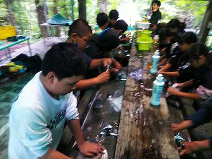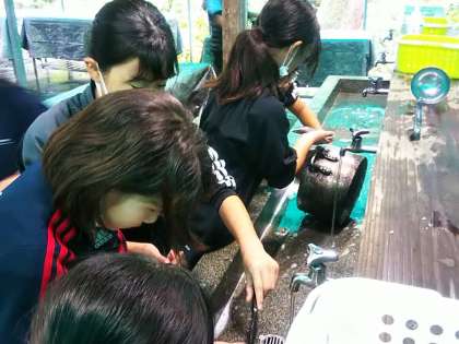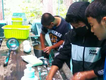 おいしくいただいた後は、後片付けです。食べる前に鍋関係以外は片付けたので、後は真っ黒に焦げた鍋です。みんなで力を合わせて洗っています。水が冷たいです。