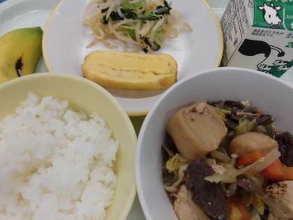 午前中、給食室の周りで作業をしていた子供たちが「いいにお〜い」と喜んでいました。すき焼きでしょうか。とってもおいしかったですね。厚焼き卵の優しい甘さもよかったです。