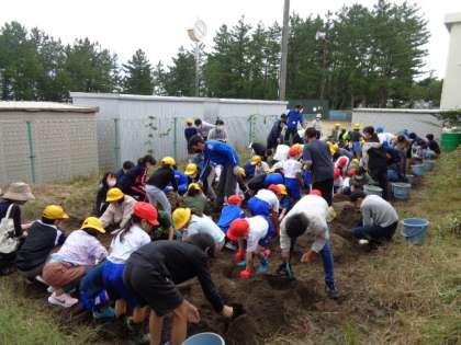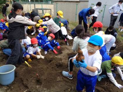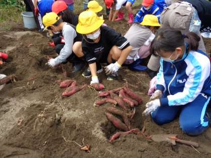 延期となっていた芋掘りを行いました。縦割り班に分かれて、子供たちは目を輝かせて次々と芋を掘り出していました。虫が出たり、大きな芋が出てきたりして、その度に歓声が上がりました。笑顔いっぱいのひとときでした。