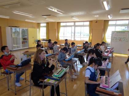 5年生は音楽。「キリマンジャロ」笛と鍵盤ハーモニカで合奏です。
