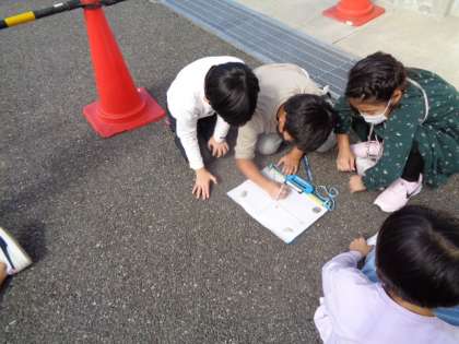 理科の学習で、かげの観察をしました。かげは時間によって向きがかわることがわかりました。かげの向きは太陽が関係しているのではないかと予想し、今日は太陽を観察しました。