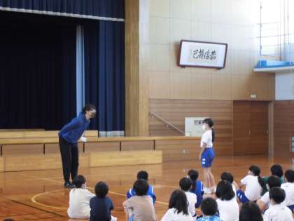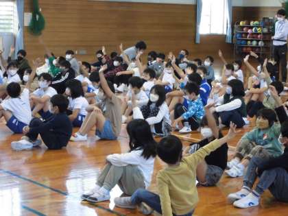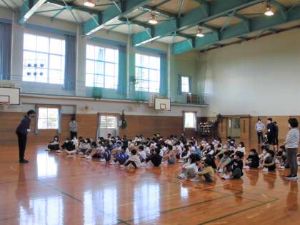 金曜日、給食後に全校児童が体育館に集まり臨時全校集会を行いました。