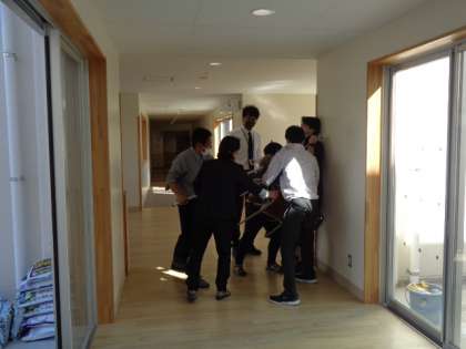 職員は、大きく2班に分かれます。子供たちを落ち着かせ管理する班と不審者に対応する班です。担当職員は不審者への説得や退去させるなどの対応を確認しました。不測の事態に対応できるよう訓練を大切にしていきたいです。