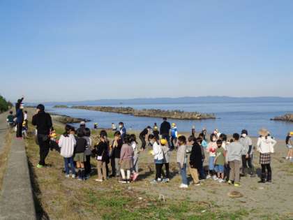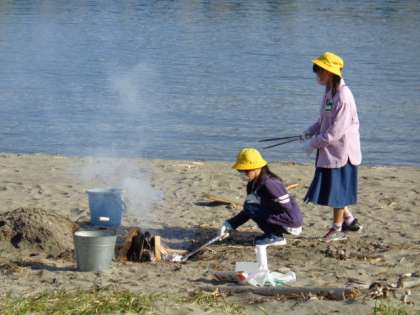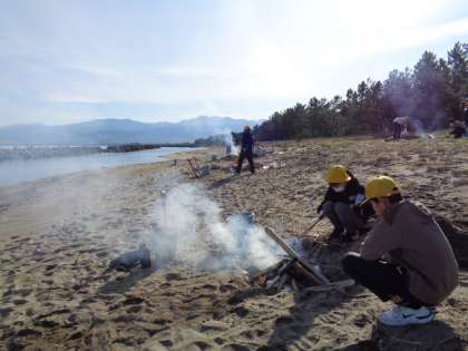 グラウンドそばの海岸に全校児童が集まり、シーサイド焼き芋が始まりました。
