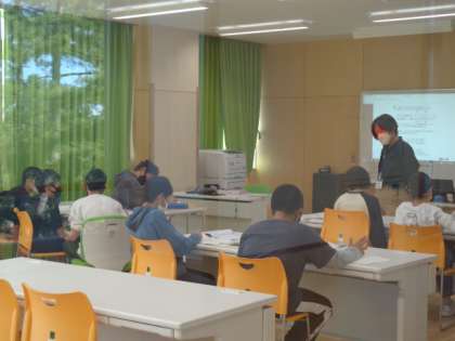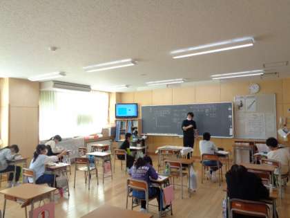 6年生は算数。比例の学習でグラフを扱っています。少人数指導を行っており、2つのグループに分かれて学習しています。
